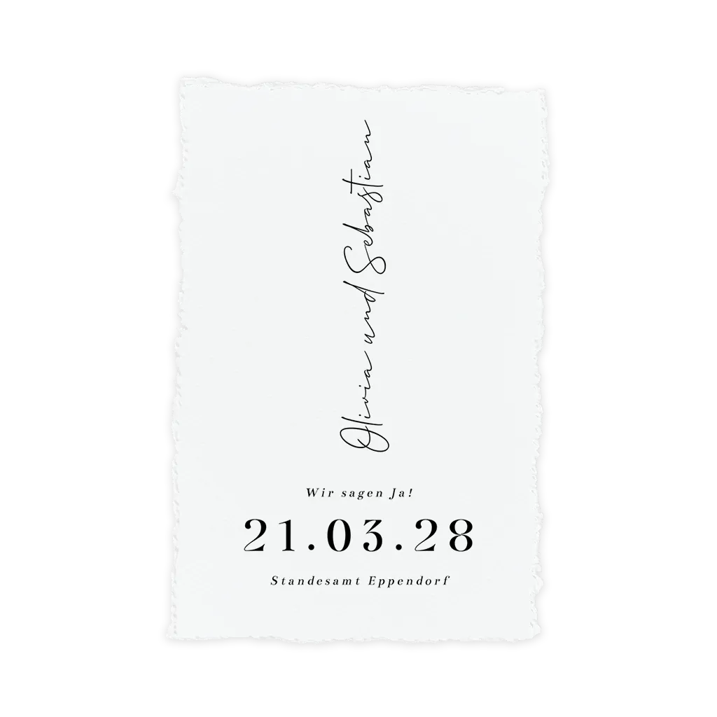 Moderne Hochzeitseinladung im Büttenpapier-Stil mit vertikaler Schrift und minimalistischem Layout.
