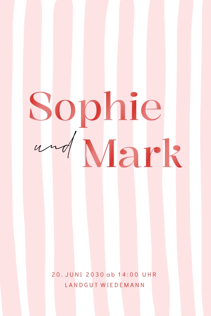 Moderne Hochzeitseinladung im Candy-Look mit Streifen. Dieses Design ist perfekt für Paare, die nach einer modernen und verspielten Einladung suchen.