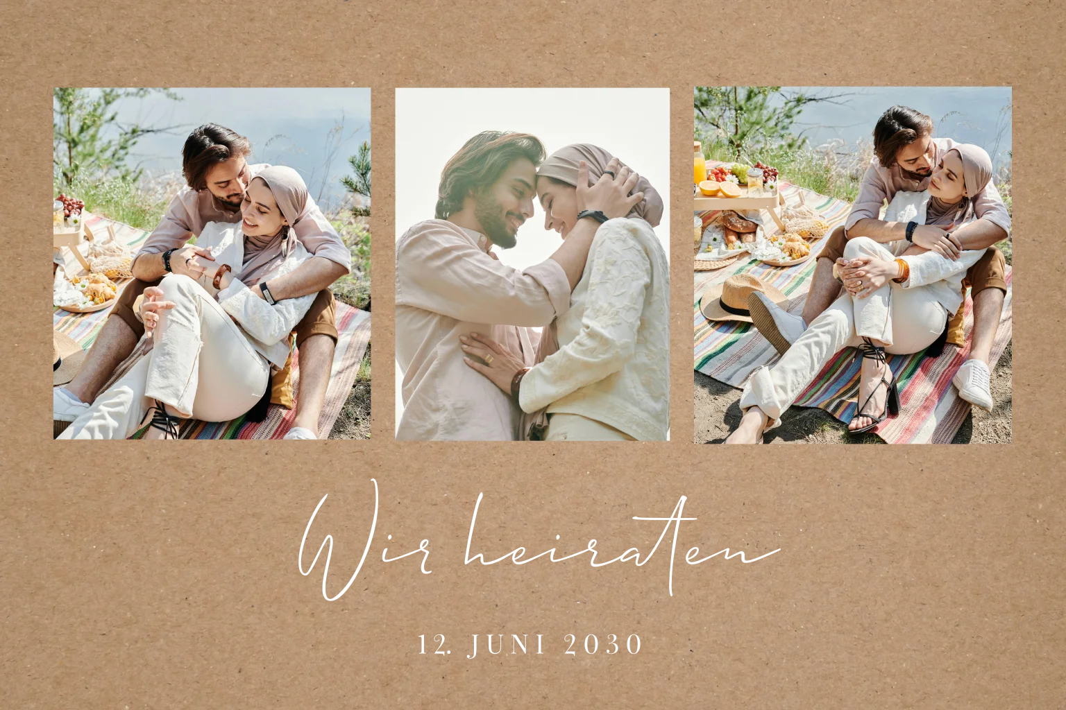 Moderne Hochzeitseinladung im Kraft-Look mit drei Fotos und Goldfolie. Dieses Design ist perfekt für Paare, die nach einer natürlichen und stilvollen Einladung suchen.