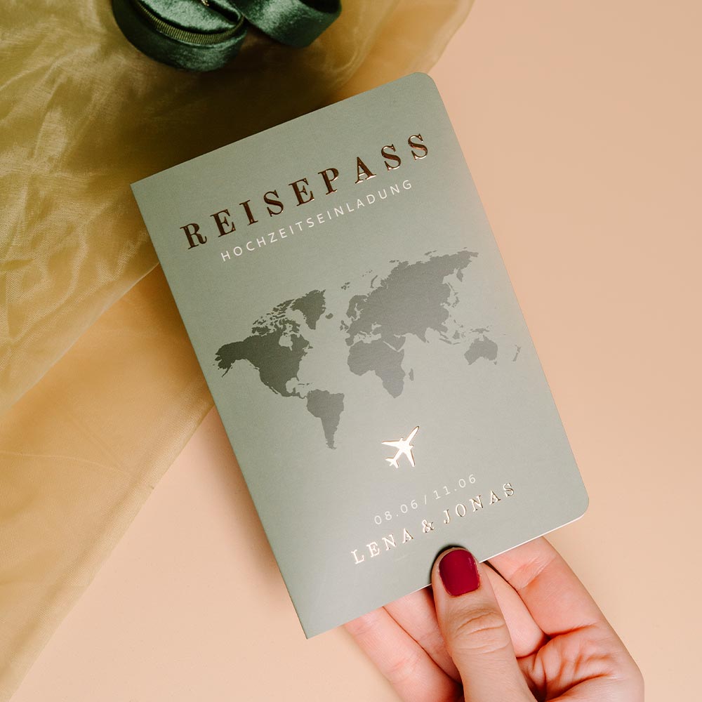 Seid ihr ein reiselustiges Paar und feiert eure Hochzeit im Ausland? Dann ist die Hochzeitseinladung "Reisepass" die perfekte Wahl für euch. Personalisiert sie einfach im Editor.Das Design der von dir gewählten Karte wurde automatisch in andere Formate umgestellt. Wähle einfach deinen Wunschformat aus und platziere alle Texte und Elemente an der richtigen Stelle im Editor. Du hast Fragen oder dein Favorit steht nicht zur Auswahl? Dann kontaktiere uns bitte und wir werden uns gemeinsam darum kümmern!