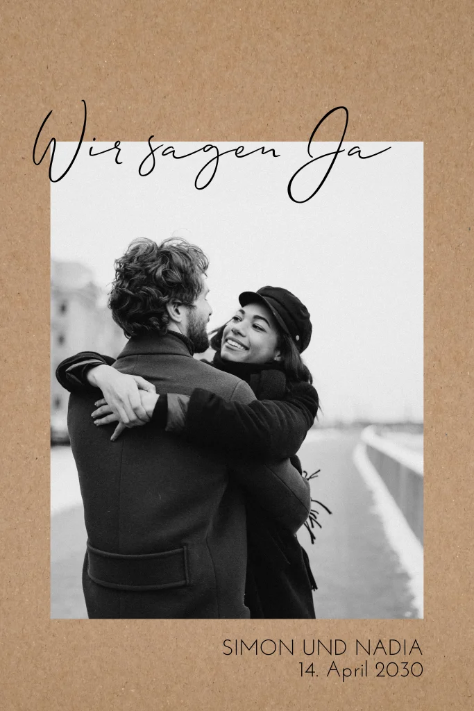 Polaroid-Hochzeitskarte im Kraft-Look mit "Wir sagen Ja". Dieses Design ist perfekt für Paare, die nach einer schlichten Einladung suchen.