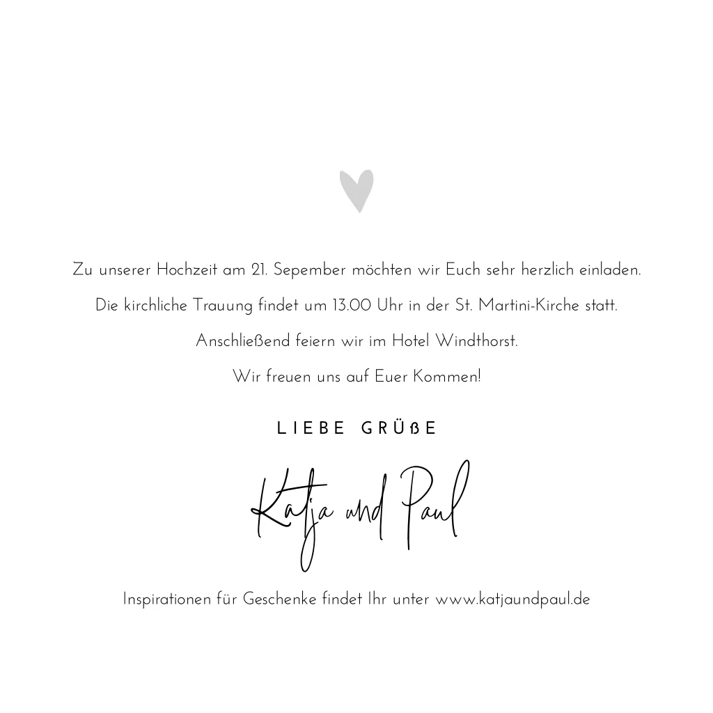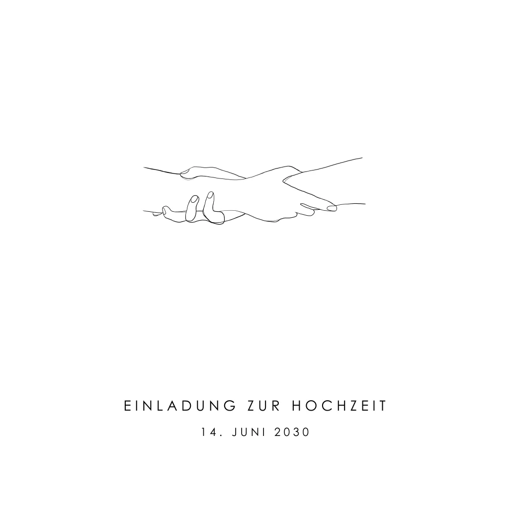 Elegante Hochzeitseinladung mit vereinten Händen und schicker Folienveredelung. Das Design ist schlicht, aber modern.Bei quadratische Karten fällt ggf. ein anderes Briefporto an. Alle Infos findest du auf der Website der Deutschen Post. Zu diesem Format erhältst du Umschläge in der Größe 14x12,5 cm. Format ändern ist möglich.
