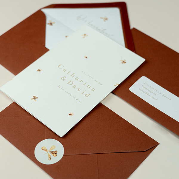 Retro-Hochzeitseinladung mit gepressten Blüten. Dieses Design ist perfekt für Paare, die nach einer romantischen und eleganten Einladung suchen.