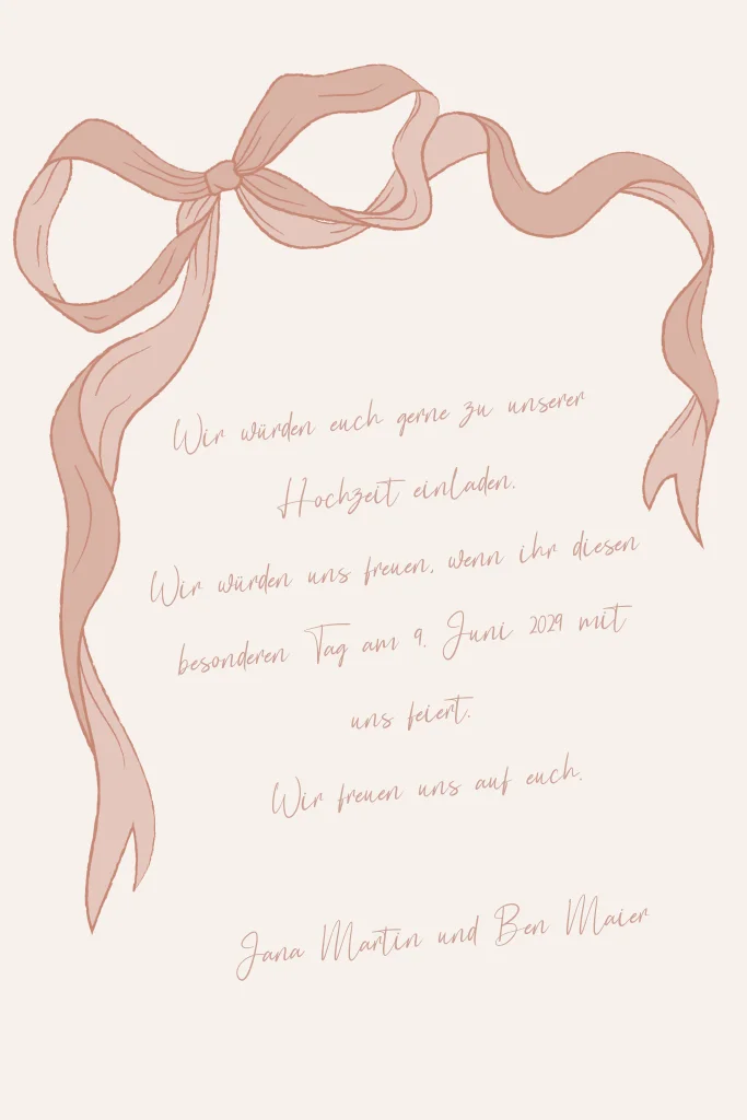 Hochzeitseinladung mit rosaner Schleife auf beigem Hintergrund. Dieses Design ist perfekt für Paare, die nach einer stilvollen und romantischen Einladung suchen.