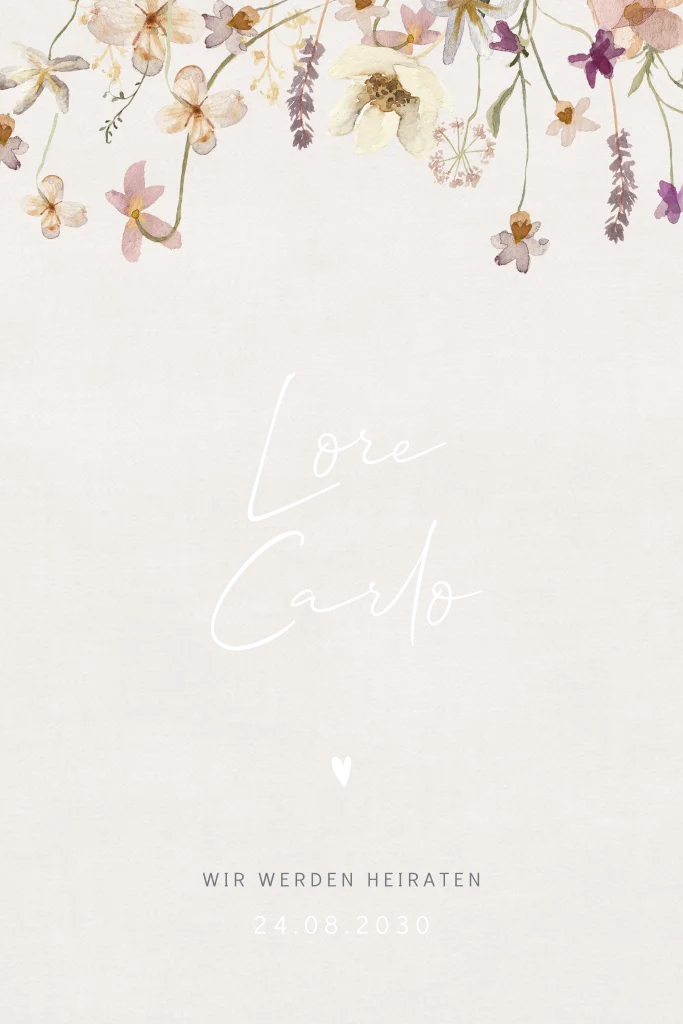 Romantische Hochzeitseinladung mit Blumen und runden Ecken. Dieses Design ist perfekt für Paare, die nach einer verspielten und floralen Einladung suchen.