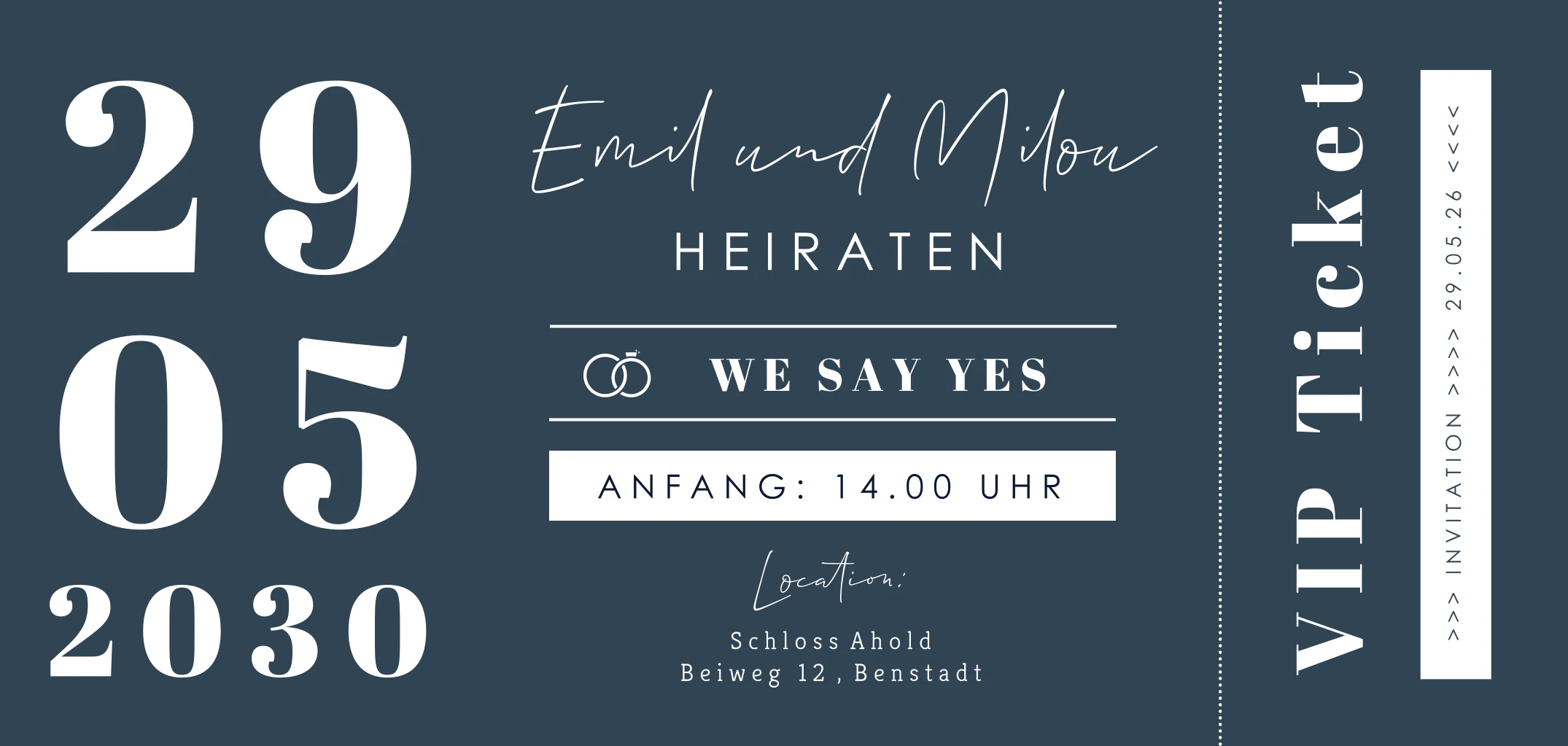 Hochzeitseinladung in Blau-Gold in VIP-Ticketform. Dieses Design ist perfekt für Paare, die nach einer verspielten und ausgefallenen Einladung suchen.Melde dich für unseren Newsletter an und profitiere von exklusiven Angeboten, kreativen Ideen und Neuigkeiten aus unserer Produktwelt. Als Dankeschön für deine Anmeldung schenken wir dir einen kostenlosen Probedruck deiner Karte.