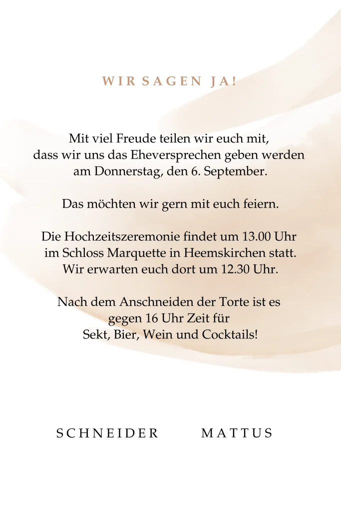 Wenn der Termin Eurer Hochzeit feststeht und die Location gebucht ist, fehlt nur noch eins: die Einladungskarten! Hochzeitseinladungen sind die wohl schönste Art, Euren großen Tag anzukündigen und damit die Vorfreude Eurer Lieben zu wecken. Ob Ihr Euren ganzen Freundeskreis einladen wollt oder im engsten Kreise der Familie heiratet, wunderschöne Hochzeitseinladungen sind einfach unerlässlich. Klare und elegante Schriftarten und ein Aquarell im Hintergrund zeichnen diese Einladung aus. Texte und Farben können in unserem Designmodul leicht geändert werden.Hast du schon die dazu passende Save the Date Karte, Menükarte und Dankeskarte gesehen?