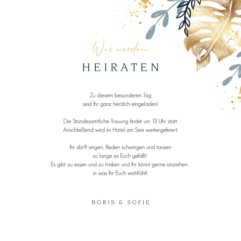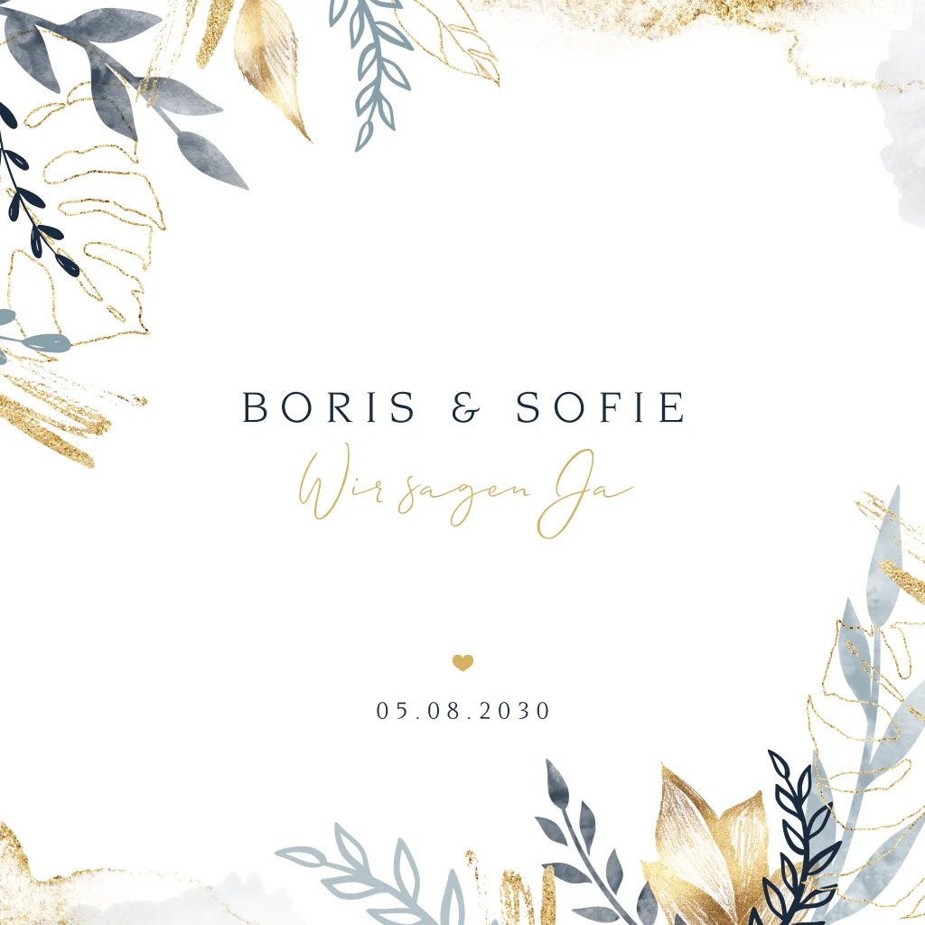 Quadratische Hochzeitseinladung mit Zweigen und Farbklecksen in Gold. Dieses Design ist perfekt für Paare, die nach einer stilvollen und floralen Einladung suchen.
