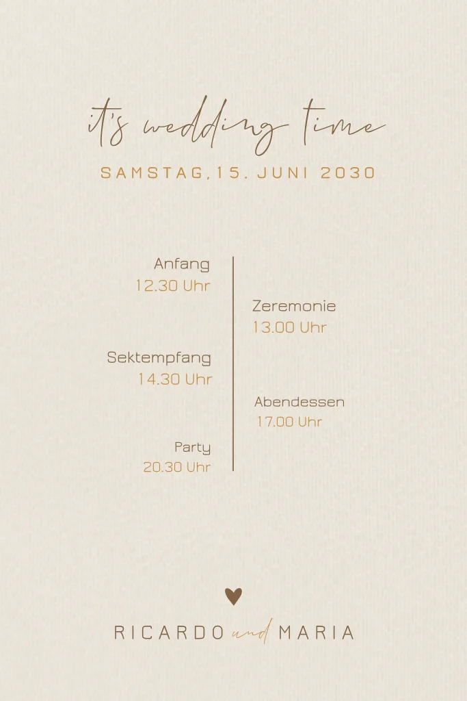 Hochzeitseinladung mit Timeline im Sandton. Dieses Design ist perfekt für Paare, die nach einer schlichten und stilvollen Einladung suchen.