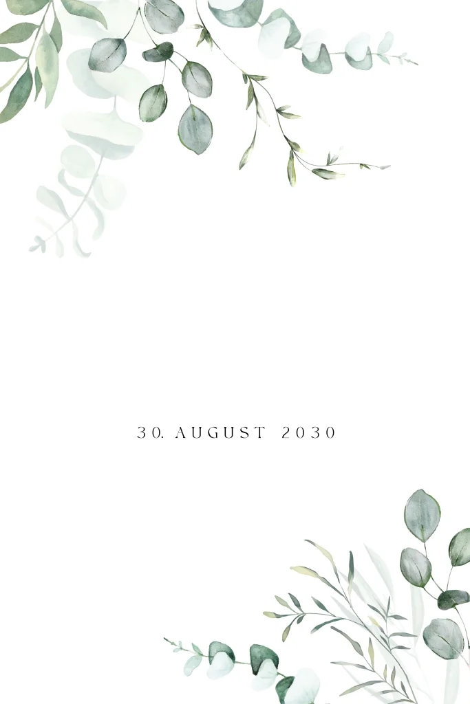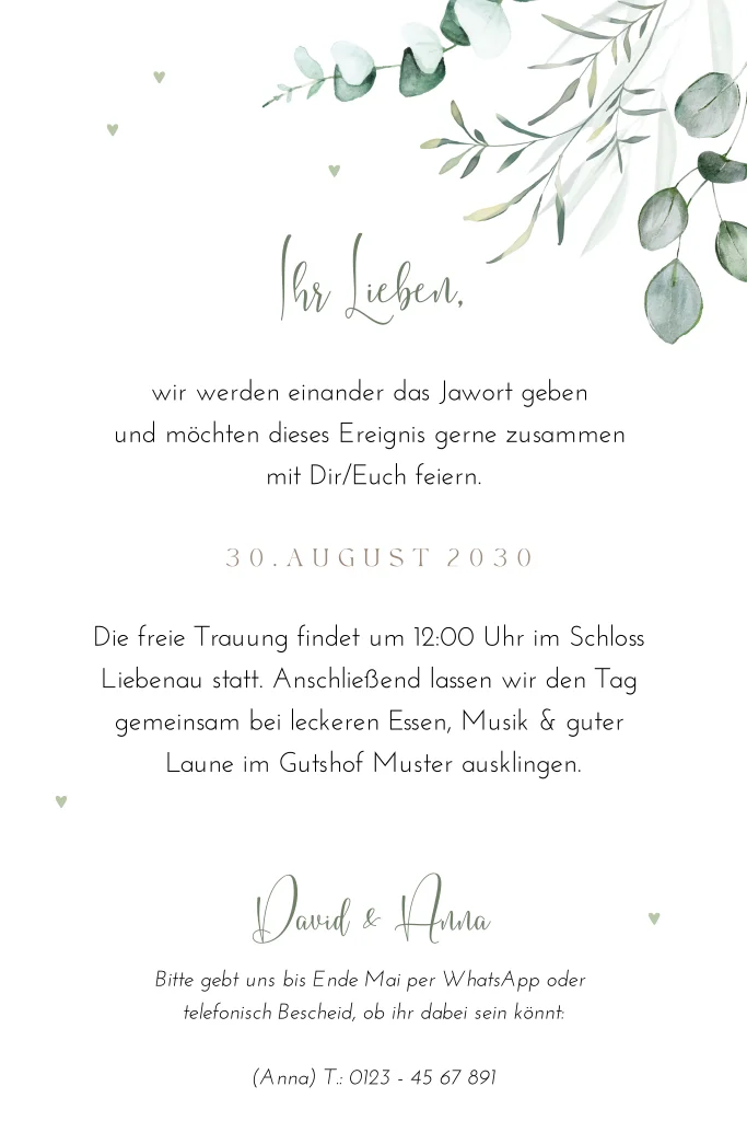 Stilvolle Einladungskarte mit Eukalyptuszweigen und goldener Schrift. Dieses Design ist perfekt für Paare, die nach einer natürlichen und stilvollen Einladung suchen.