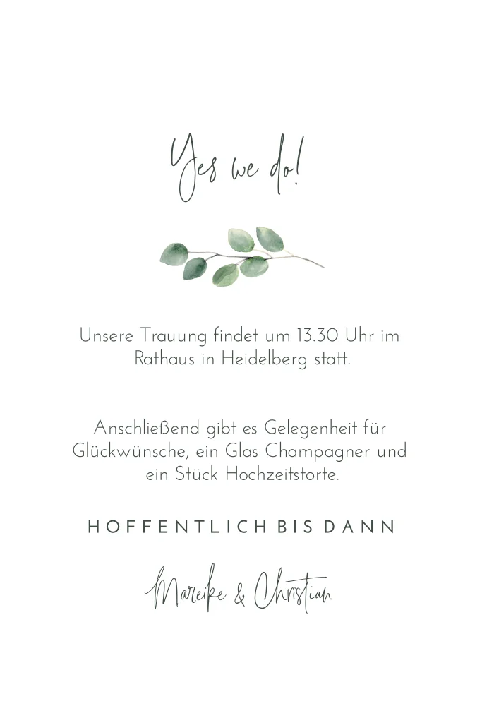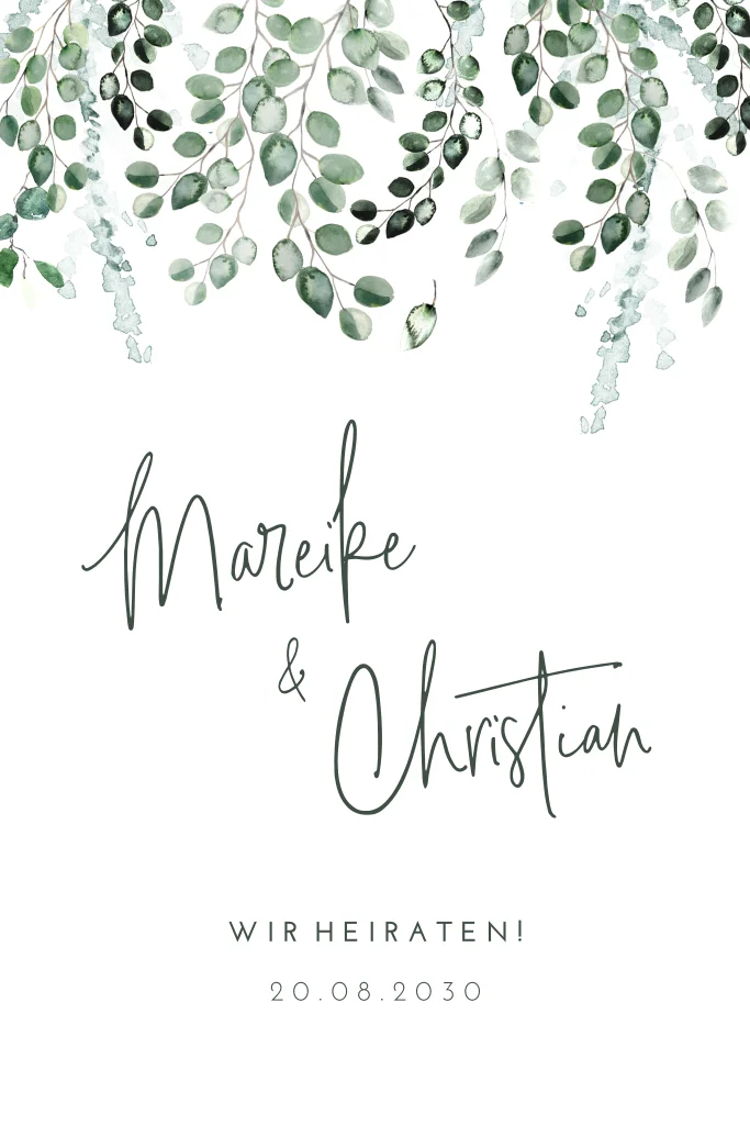 Diese rechteckige, florale Klappkarte hat einen klassischen Look und ist mit tollen Zweigen verziert, die über den Namen des Brautpaares hängen. Diese stehen in eleganten gleichfarbenen zierlichen Buchstaben auf der Vorderseite.Melde dich für unseren Newsletter an und profitiere von exklusiven Angeboten, kreativen Ideen und Neuigkeiten aus unserer Produktwelt. Als Dankeschön für deine Anmeldung schenken wir dir einen kostenlosen Probedruck deiner Karte.