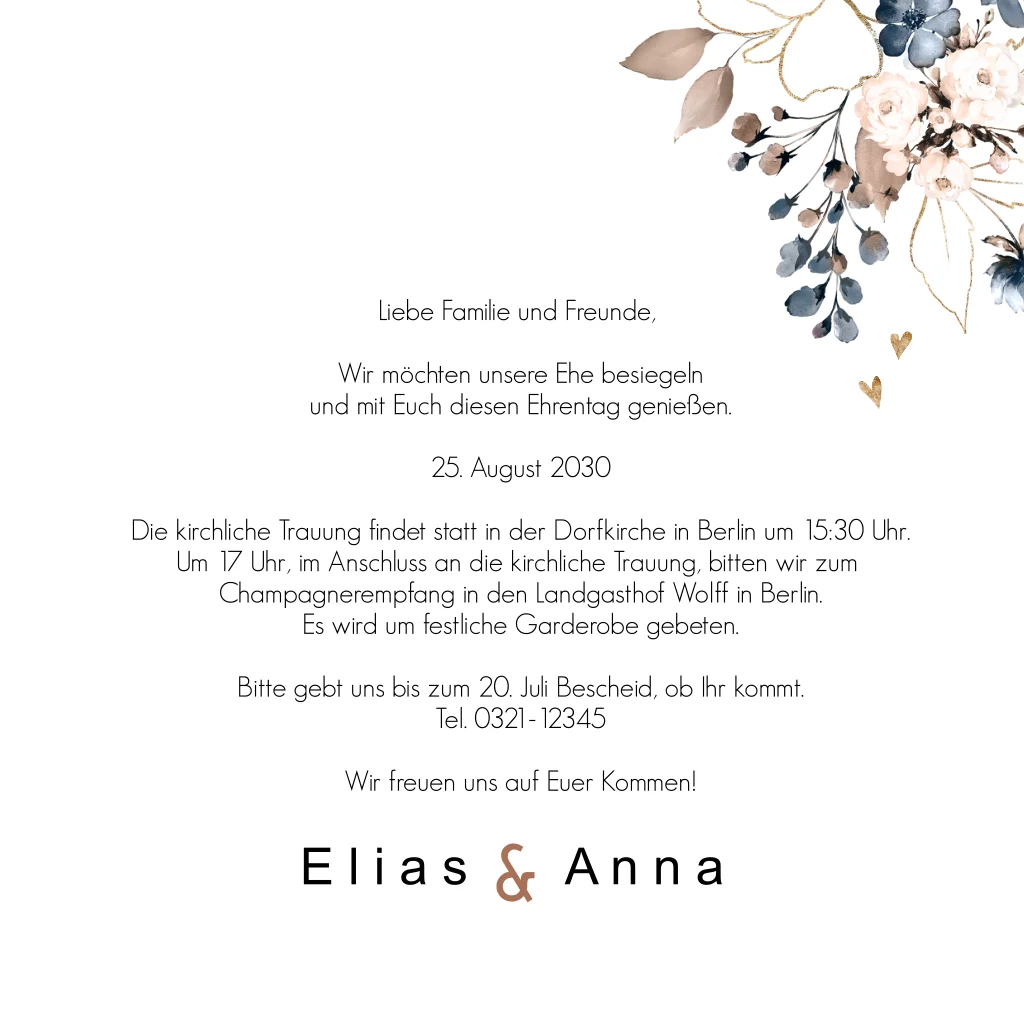 Was für ein wunderschöner Blumenstrauß! Darin spiegeln sich die Trendfarben Gold, Blau und Taupe wider. Die Herzen auf dieser Karte sind auch überaus süß. Mit der geradlinigen Schriftart ist diese stilvolle, moderne Hochzeitskarte komplett!Bei quadratische Karten fällt ggf. ein anderes Briefporto an. Alle Infos findest du auf der Website der Deutschen Post. Zu diesem Format erhältst du Umschläge in der Größe 14x12,5 cm. Format ändern ist möglich.