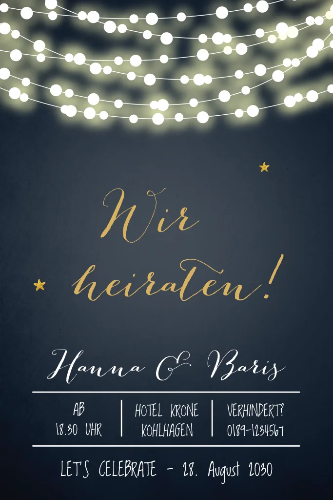 Hochzeitseinladung mit Lichterzauber auf dunkelblauem Hintergrund. Dieses Design ist perfekt für Paare, die nach einer stilvollen und romantischen Einladung suchen.