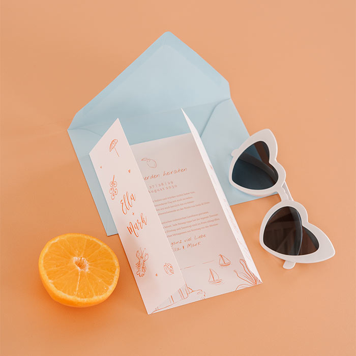 Verspielte Hochzeitseinladung als Faltkarte mit kleinen Illustrationen. Dieses liebevoll gestaltete Design ist perfekt für Paare, die eine fröhliche und kreative Einladung suchen. Die zarten Zeichnungen und das verspielte Layout verleihen der Karte eine persönliche und charmante Note.Melde dich für unseren Newsletter an und entdecke exklusive Angebote, kreative Inspirationen und spannende Neuigkeiten aus unserer Produktwelt. Als Dankeschön erhältst du 5 € Rabatt auf deine nächste Bestellung.