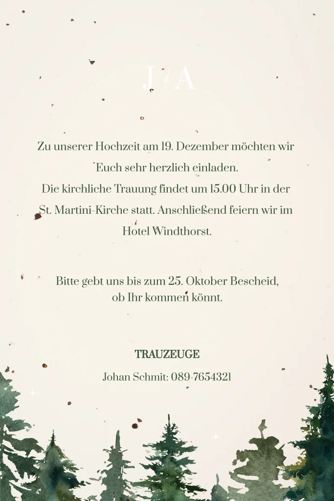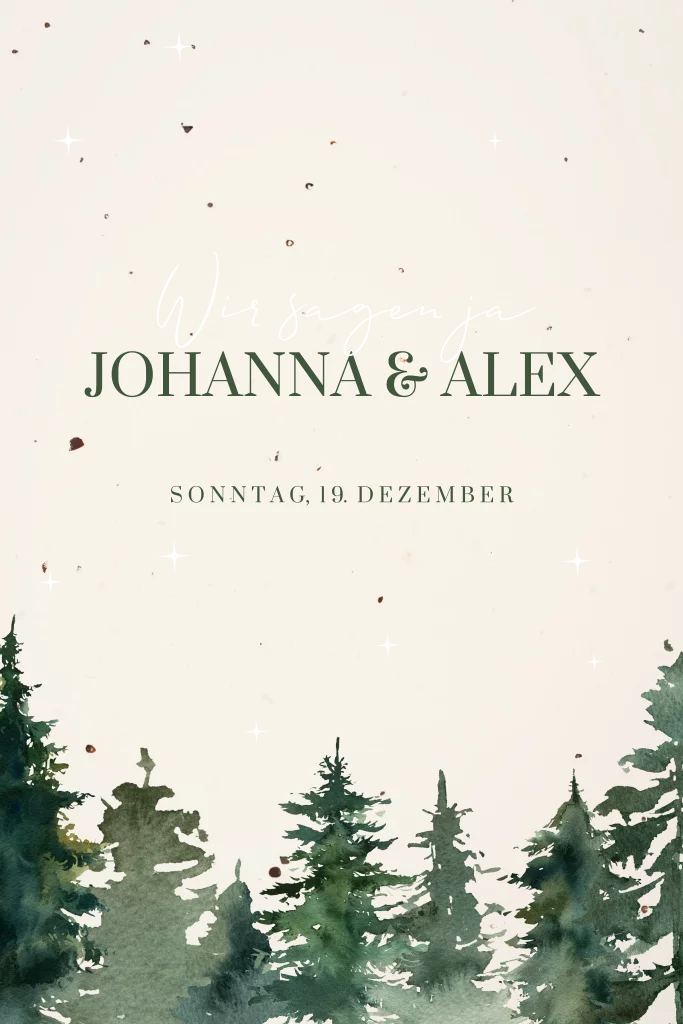 Winterliche Einladung zur Hochzeit mit Tannen und Sternen. Dieses Design ist perfekt für Paare, die nach einer schlichten und romantischen Einladung suchen.