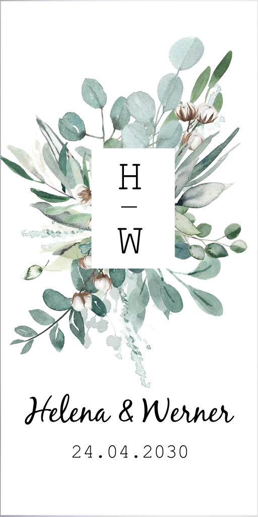 Hochzeitskerze Eukalyptus und Monogramm – 20 cm hoch, 8 cm Ø
