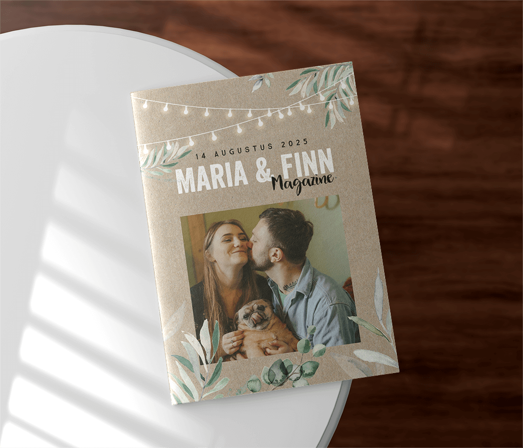 Das komplette Heft ist gedruckt auf Silk MC Papier (135g/m²) mit beidseitiger Seidenbeschichtung und mit Heftklammern gebunden. Wir haben sowohl ein 8- als auch ein 12-seitiges Heft im Sortiment. Diese Version hier hat 12 Seiten; wenn du 8 Seiten möchtest, kontaktiere uns bitte dahingehend.
