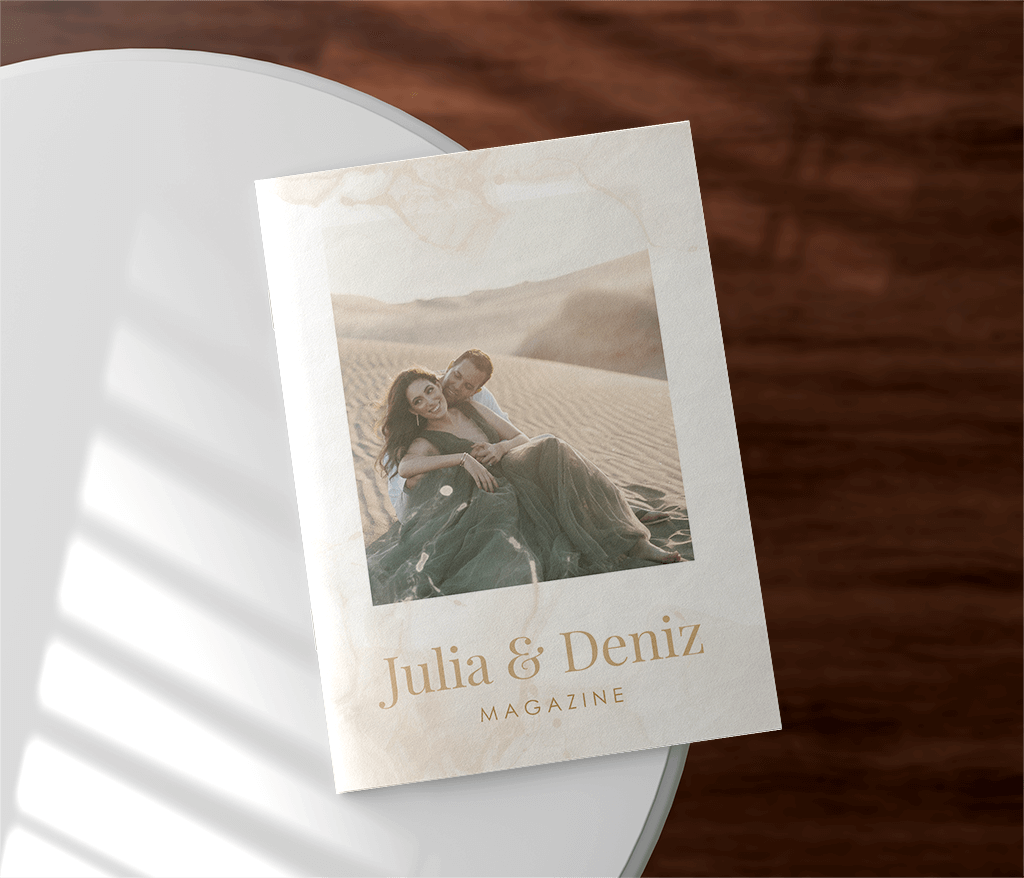 Das komplette Heft ist gedruckt auf Silk MC Papier (135g/m²) mit beidseitiger Seidenbeschichtung und mit Heftklammern gebunden. Wir haben sowohl ein 8- als auch ein 12-seitiges Heft im Sortiment. Diese Version hier hat 12 Seiten; wenn du 8 Seiten möchtest, kontaktiere uns bitte dahingehend.