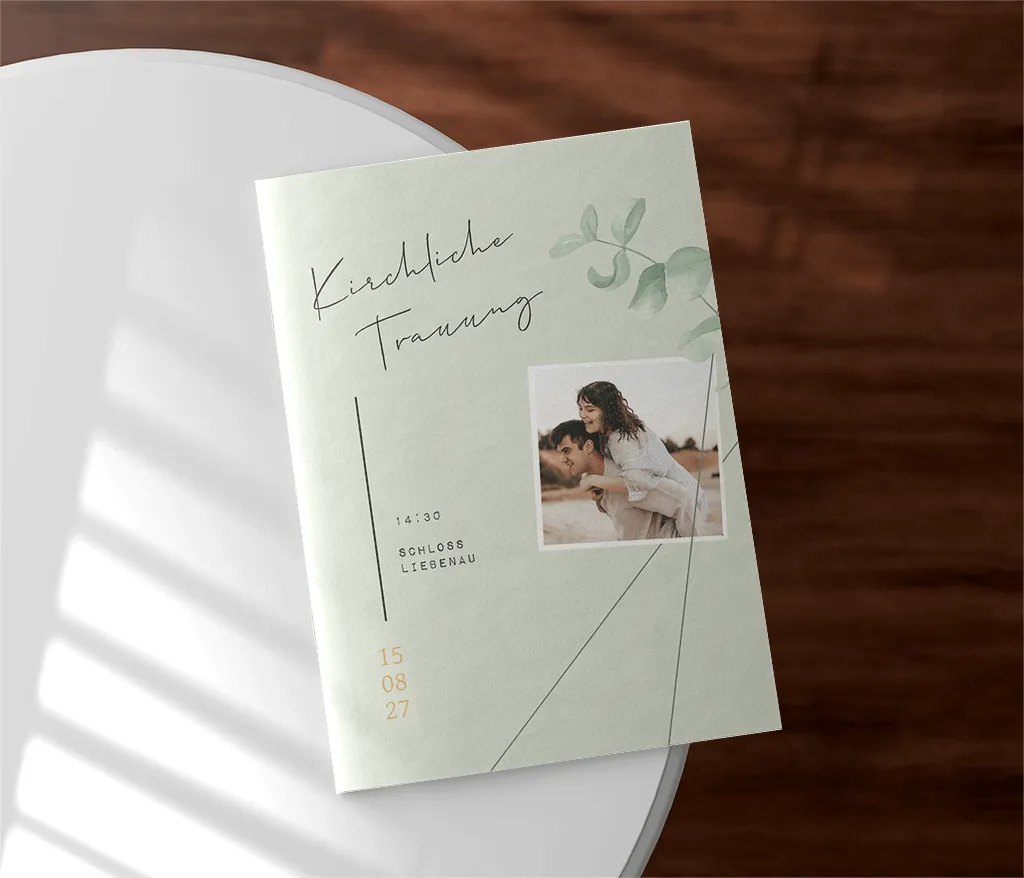 Das Kirchenheft wird durch zwei Heftklammern stabil zusammengehalten und kann sowohl auf Papier mit matter Oberfläche (Holzfreies Papier 170g/m²) als auch auf Papier mit glattem, leicht glänzendem Papier (Seidenglanz 170g/m²) gedruckt werden. Du kannst dabei zwischen einem 4-, 8- oder 12-seitigen Heft wählen.