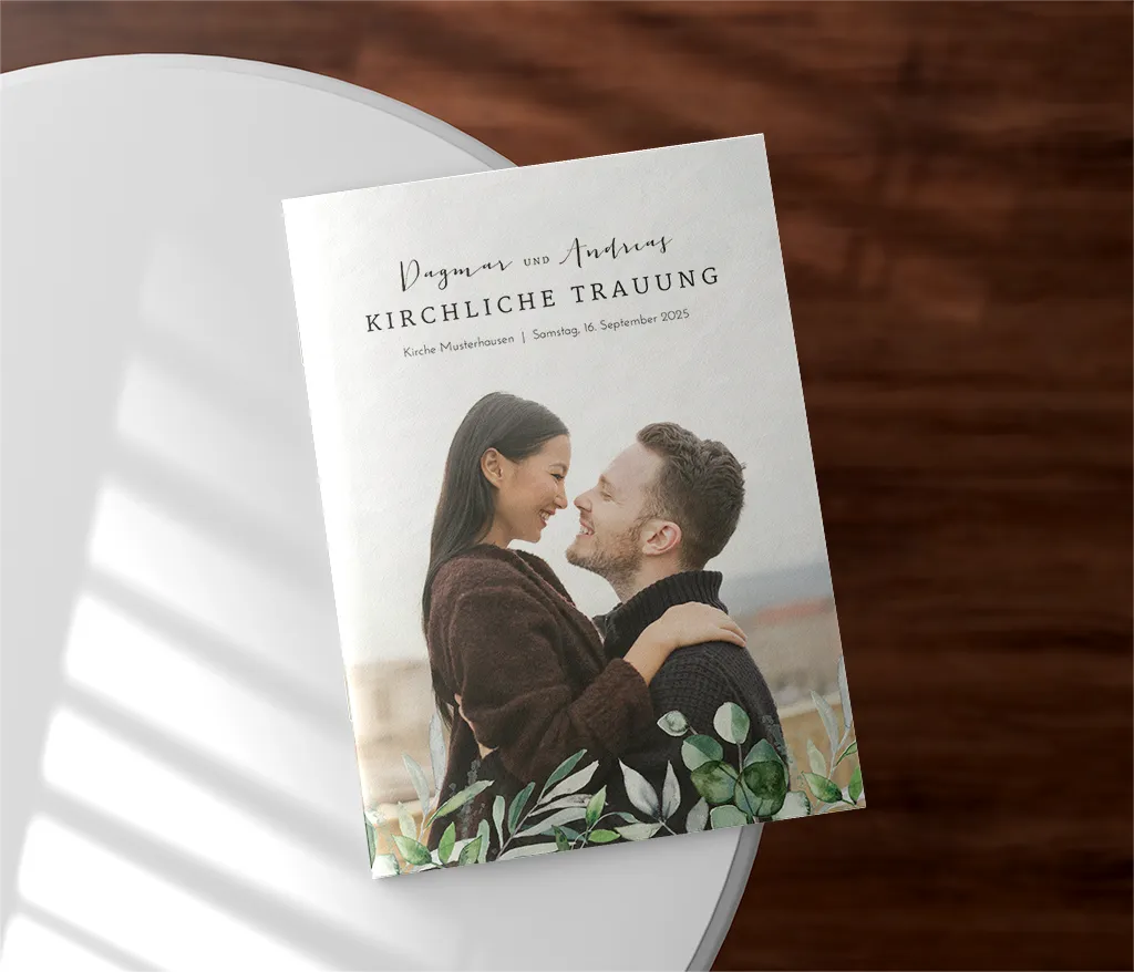Das Kirchenheft wird durch zwei Heftklammern stabil zusammengehalten und kann sowohl auf Papier mit matter Oberfläche (Holzfreies Papier 170g/m²) als auch auf Papier mit glattem, leicht glänzendem Papier (Seidenglanz 170g/m²) gedruckt werden. Du kannst dabei zwischen einem 4-, 8- oder 12-seitigen Heft wählen.