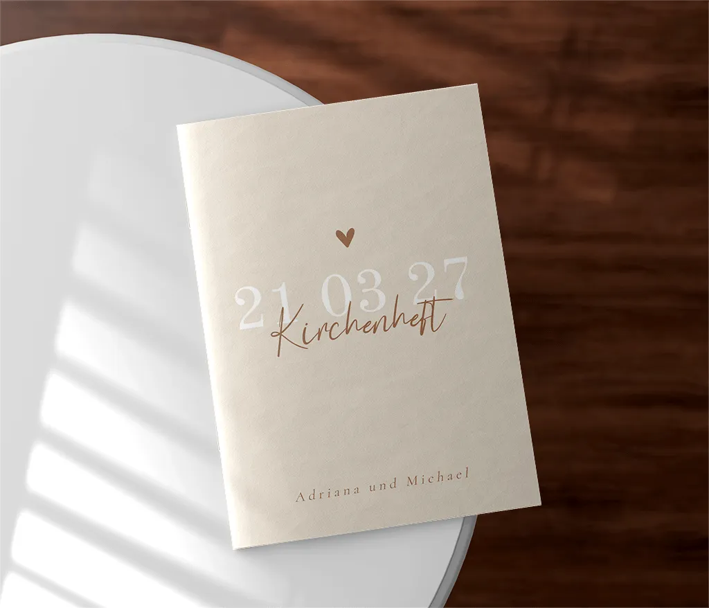 Das Kirchenheft wird durch zwei Heftklammern stabil zusammengehalten und kann sowohl auf Papier mit matter Oberfläche (Holzfreies Papier 170g/m²) als auch auf Papier mit glattem, leicht glänzendem Papier (Seidenglanz 170g/m²) gedruckt werden. Du kannst dabei zwischen einem 4-, 8- oder 12-seitigen Heft wählen.