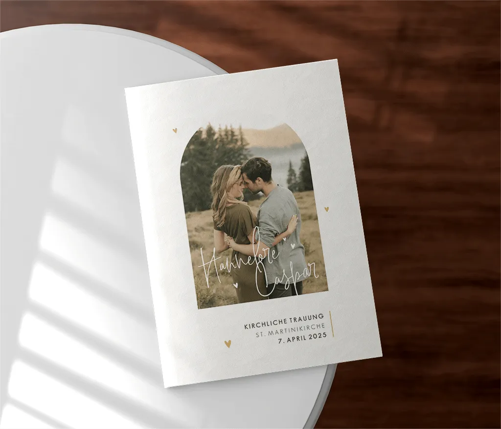 Das Kirchenheft wird durch zwei Heftklammern stabil zusammengehalten und kann sowohl auf Papier mit matter Oberfläche (Holzfreies Papier 170g/m²) als auch auf Papier mit glattem, leicht glänzendem Papier (Seidenglanz 170g/m²) gedruckt werden. Du kannst dabei zwischen einem 4-, 8- oder 12-seitigen Heft wählen.