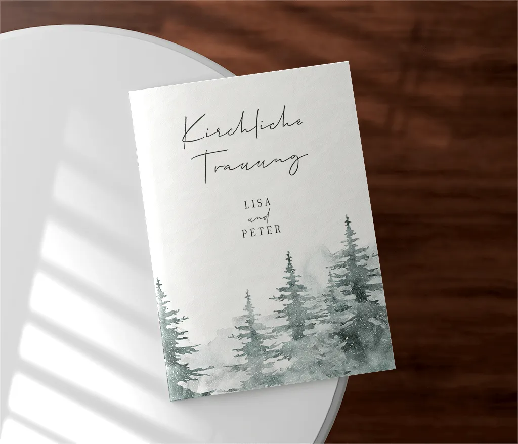 Das Kirchenheft wird durch zwei Heftklammern stabil zusammengehalten und kann sowohl auf Papier mit matter Oberfläche (Holzfreies Papier 170g/m²) als auch auf Papier mit glattem, leicht glänzendem Papier (Seidenglanz 170g/m²) gedruckt werden. Du kannst dabei zwischen einem 4-, 8- oder 12-seitigen Heft wählen.