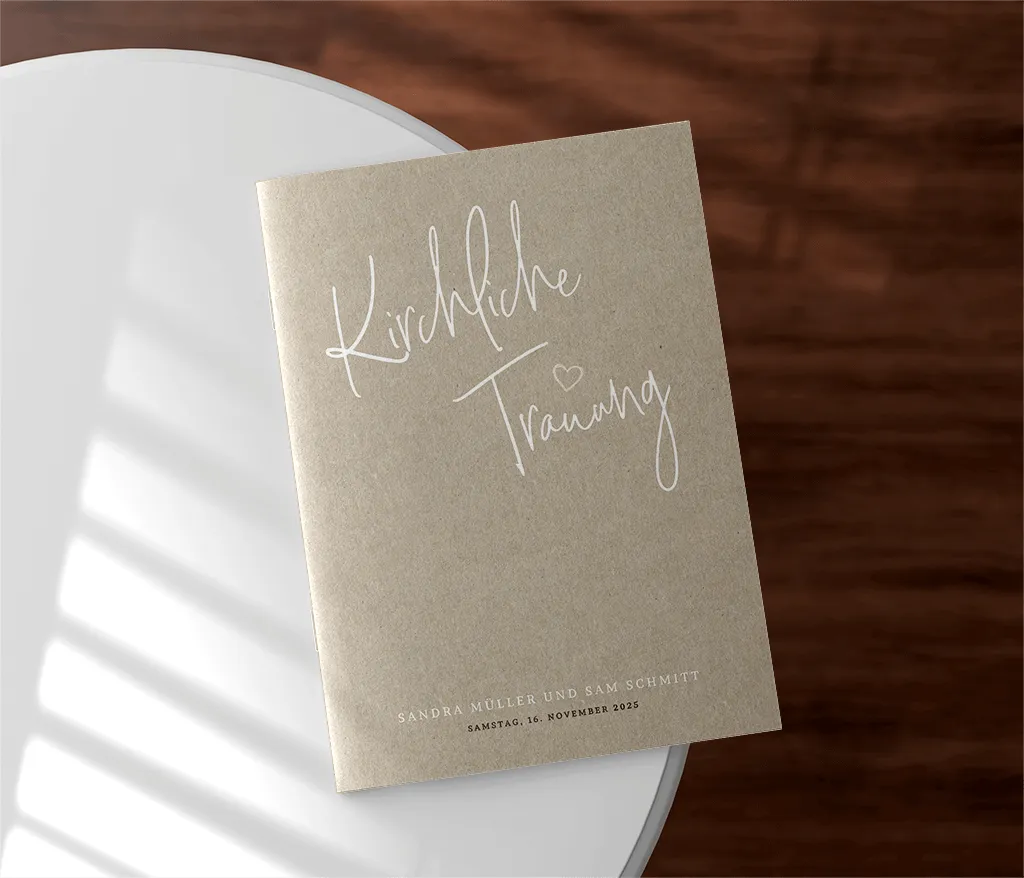Das Kirchenheft wird durch zwei Heftklammern stabil zusammengehalten und kann sowohl auf Papier mit matter Oberfläche (Holzfreies Papier 170g/m²) als auch auf Papier mit glattem, leicht glänzendem Papier (Seidenglanz 170g/m²) gedruckt werden. Du kannst dabei zwischen einem 4-, 8- oder 12-seitigen Heft wählen.