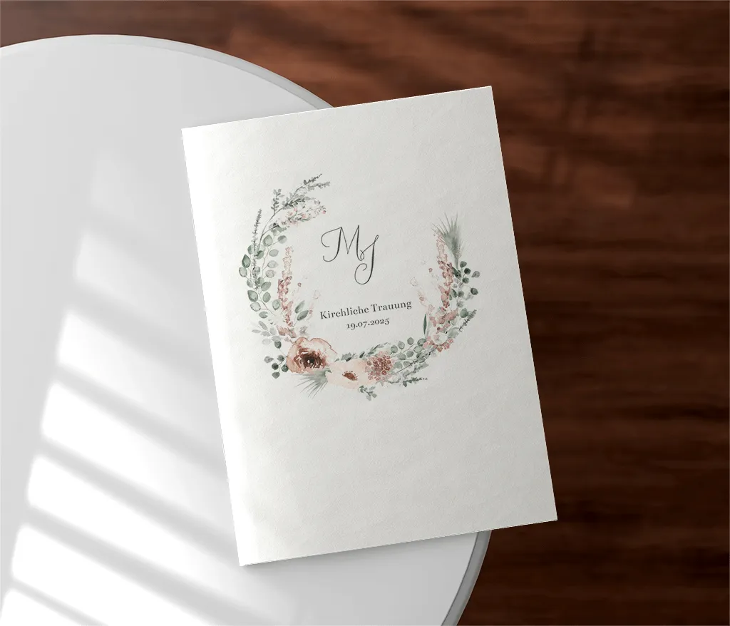 Das Kirchenheft wird durch zwei Heftklammern stabil zusammengehalten und kann sowohl auf Papier mit matter Oberfläche (Holzfreies Papier 170g/m²) als auch auf Papier mit glattem, leicht glänzendem Papier (Seidenglanz 170g/m²) gedruckt werden. Du kannst dabei zwischen einem 4-, 8- oder 12-seitigen Heft wählen.
