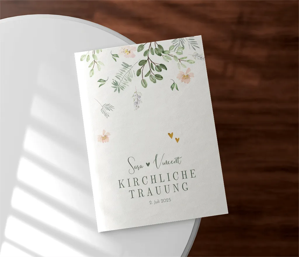 Das Kirchenheft wird durch zwei Heftklammern stabil zusammengehalten und kann sowohl auf Papier mit matter Oberfläche (Holzfreies Papier 170g/m²) als auch auf Papier mit glattem, leicht glänzendem Papier (Seidenglanz 170g/m²) gedruckt werden. Du kannst dabei zwischen einem 4-, 8- oder 12-seitigen Heft wählen.