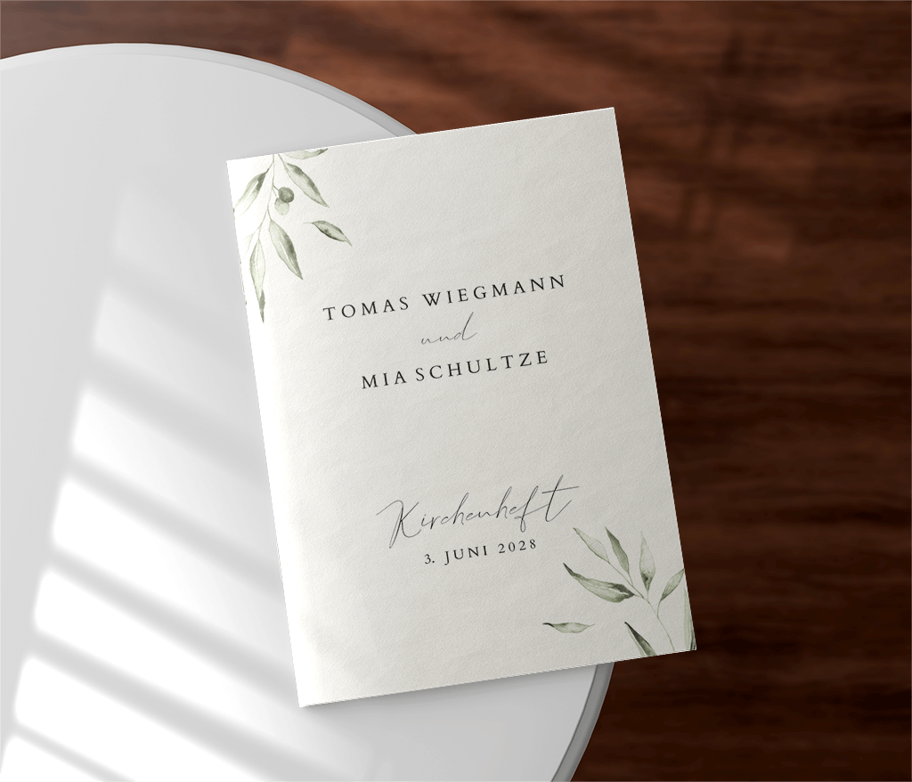 Das Kirchenheft wird durch zwei Heftklammern stabil zusammengehalten und kann sowohl auf Papier mit matter Oberfläche (Holzfreies Papier 170g/m²) als auch auf Papier mit glattem, leicht glänzendem Papier (Seidenglanz 170g/m²) gedruckt werden. Du kannst dabei zwischen einem 4-, 8- oder 12-seitigen Heft wählen.