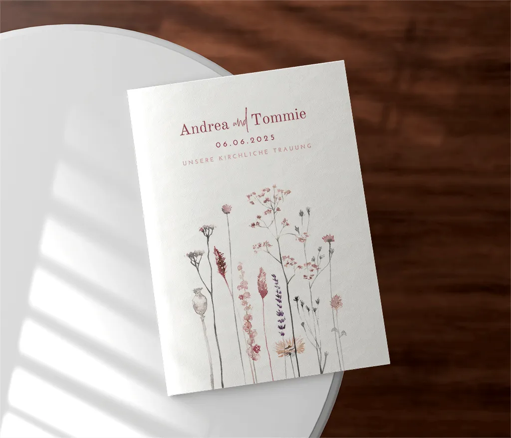 Das Kirchenheft wird durch zwei Heftklammern stabil zusammengehalten und kann sowohl auf Papier mit matter Oberfläche (Holzfreies Papier 170g/m²) als auch auf Papier mit glattem, leicht glänzendem Papier (Seidenglanz 170g/m²) gedruckt werden. Du kannst dabei zwischen einem 4-, 8- oder 12-seitigen Heft wählen.