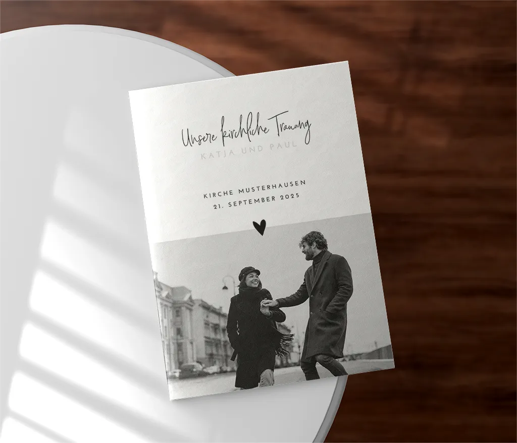 Das Kirchenheft wird durch zwei Heftklammern stabil zusammengehalten und kann sowohl auf Papier mit matter Oberfläche (Holzfreies Papier 170g/m²) als auch auf Papier mit glattem, leicht glänzendem Papier (Seidenglanz 170g/m²) gedruckt werden. Du kannst dabei zwischen einem 4-, 8- oder 12-seitigen Heft wählen.