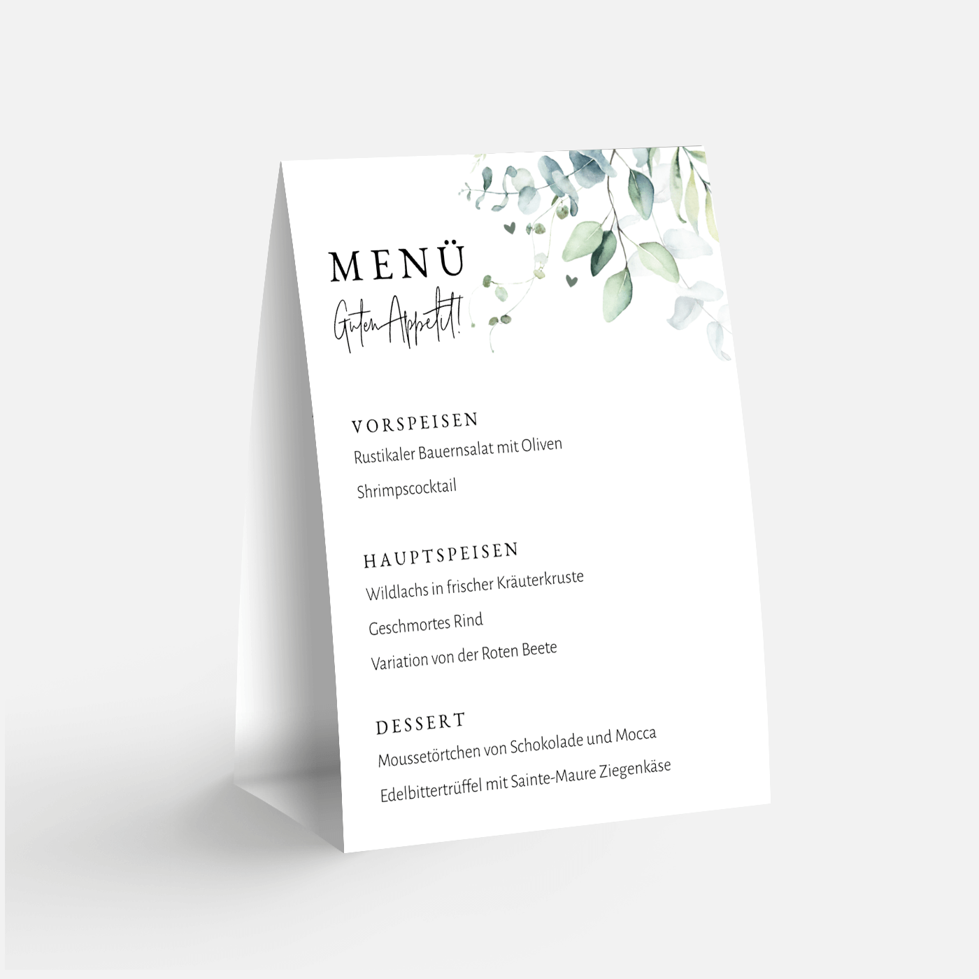 Aufsteller Menükarte mit kunstvollem Schriftzug und Aquarellzweigen