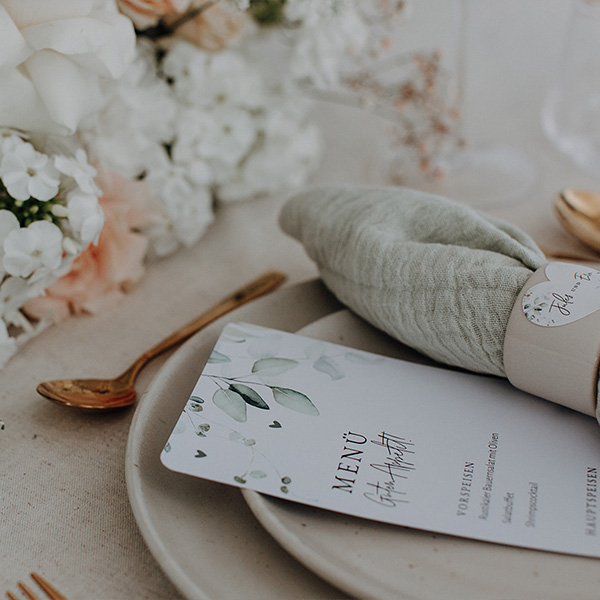 Haben eure Gäste ihren Platz im Saal, im Restaurant oder auf der bestuhlten Terrasse erst einmal gefunden, geht der erste Griff meist zum Heft mit dem Hochzeitsmenü. Wichtig also, um die Menükarte mit Sorgfalt auszuwählen.Dazu empfehlen wir stylische Kartenhalter aus echtem Holz, um die Karte in voller Pracht zu präsentieren. Hier gelangst du direkt zur Auswahl.