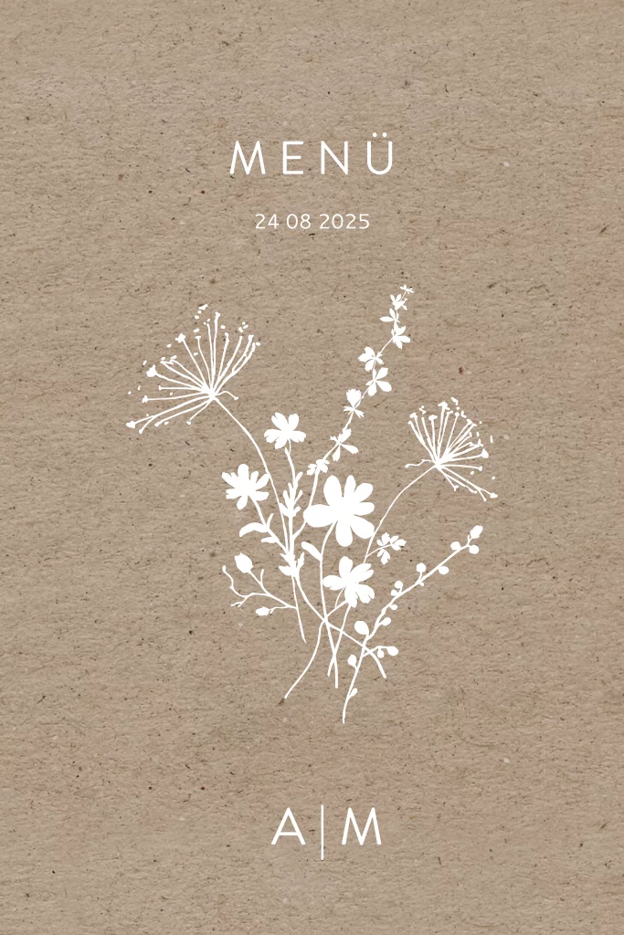 Haben eure Gäste ihren Platz im Saal, im Restaurant oder auf der bestuhlten Terrasse erst einmal gefunden, geht der erste Griff meist zum Heft mit dem Hochzeitsmenü. Wichtig also, um die Menükarte mit Sorgfalt auszuwählen. Karten auf Vintage Kraftpapier bestechen durch einen trendigen Designkarton im rustic Kraftpapier-Look und sind mit modernen Schriftzügen und stilvollen Blumen bestückt absolut im Trend.Das Design der von dir gewählten Karte wurde automatisch in andere Formate umgestellt. Wähle einfach deinen Wunschformat aus und platziere alle Texte und Elemente an der richtigen Stelle im Editor. Du hast Fragen oder dein Favorit steht nicht zur Auswahl? Dann kontaktiere uns bitte und wir werden uns gemeinsam darum kümmern!
