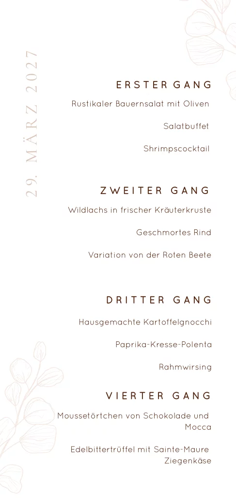 Elegante Menükarte zur Hochzeit mit filigranen Zweigen