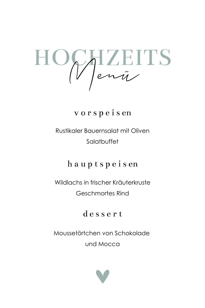 Das Menüheft bzw. die Menükarte auf dem feierlich gedeckten Tisch lässt eure Gäste von Herzen zugreifen. Neben den Tischkarten sind die Menühefte der wichtigste Teil der Hochzeitspapeterie für die Feierlichkeiten nach der Trauung.Dazu empfehlen wir stylische Kartenhalter aus echtem Holz, um die Karte in voller Pracht zu präsentieren. Hier gelangst du direkt zur Auswahl.