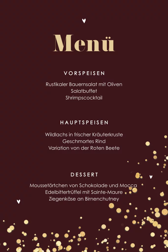 Klassische Menükarte zum Jubiläum mit Goldtupfern und Herzen