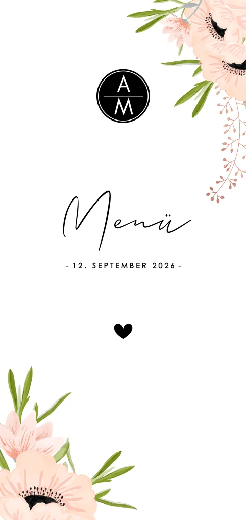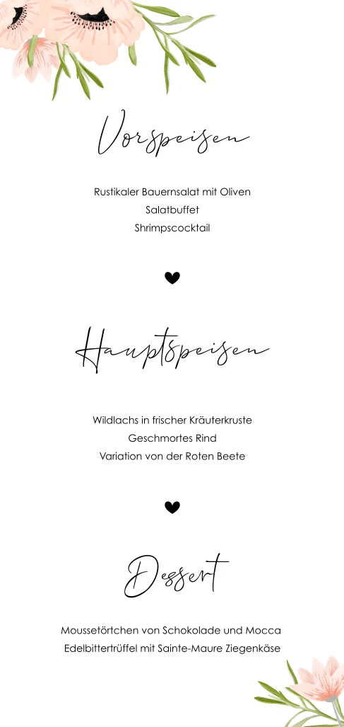 Klassische Menükarte mit rosa Blumen.Melde dich für unseren Newsletter an und profitiere von exklusiven Angeboten, kreativen Ideen und Neuigkeiten aus unserer Produktwelt. Als Dankeschön für deine Anmeldung schenken wir dir einen kostenlosen Probedruck deiner Karte.