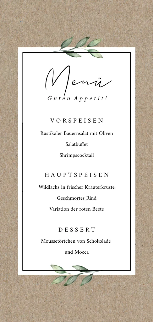Haben eure Gäste ihren Platz im Saal, im Restaurant oder auf der bestuhlten Terrasse erst einmal gefunden, geht der erste Griff meist zum Heft mit dem Hochzeitsmenü. Wichtig also, um die Menükarte mit Sorgfalt auszuwählen. Gut zu wissen:Dazu empfehlen wir stylische Kartenhalter aus echtem Holz, um die Karte in voller Pracht zu präsentieren. Hier gelangst du direkt zur Auswahl.