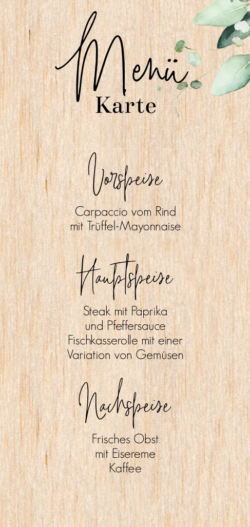 Haben eure Gäste ihren Platz im Saal, im Restaurant oder auf der bestuhlten Terrasse erst einmal gefunden, geht der erste Griff meist zum Hochzeitsmenü. Wichtig also, um die Menükarte mit Sorgfalt auszuwählen.Dazu empfehlen wir stylische Kartenhalter aus echtem Holz, um die Karte in voller Pracht zu präsentieren. Hier gelangst du direkt zur Auswahl.