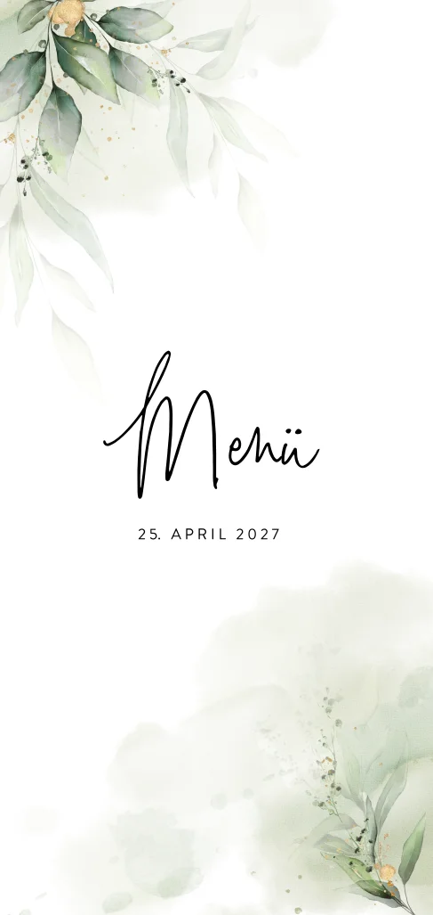 Schickes Menü mit zartem grünem Aquarell und subtilen Blättern. Mit einer angesagten und stilvollen Schriftart befindet sich auf der Vorderseite der Karte ein großes „Menü“. Die goldenen Spritzer verleihen der Karte einen trendigen Look. Auf der Rückseite ist Platz für alle Speisen.Melde dich für unseren Newsletter an und profitiere von exklusiven Angeboten, kreativen Ideen und Neuigkeiten aus unserer Produktwelt. Als Dankeschön für deine Anmeldung schenken wir dir einen kostenlosen Probedruck deiner Karte.