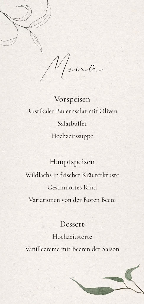 Menükarte mit grünen Blättern.Dazu empfehlen wir stylische Kartenhalter aus echtem Holz, um die Karte in voller Pracht zu präsentieren. Hier gelangst du direkt zur Auswahl.