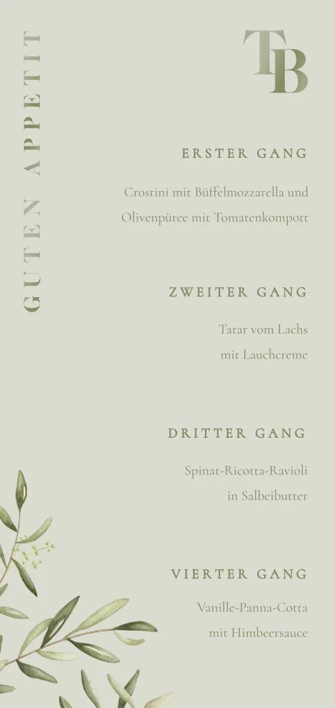 Menükarte Hochzeit in Grün mit Zweigen und Initialen