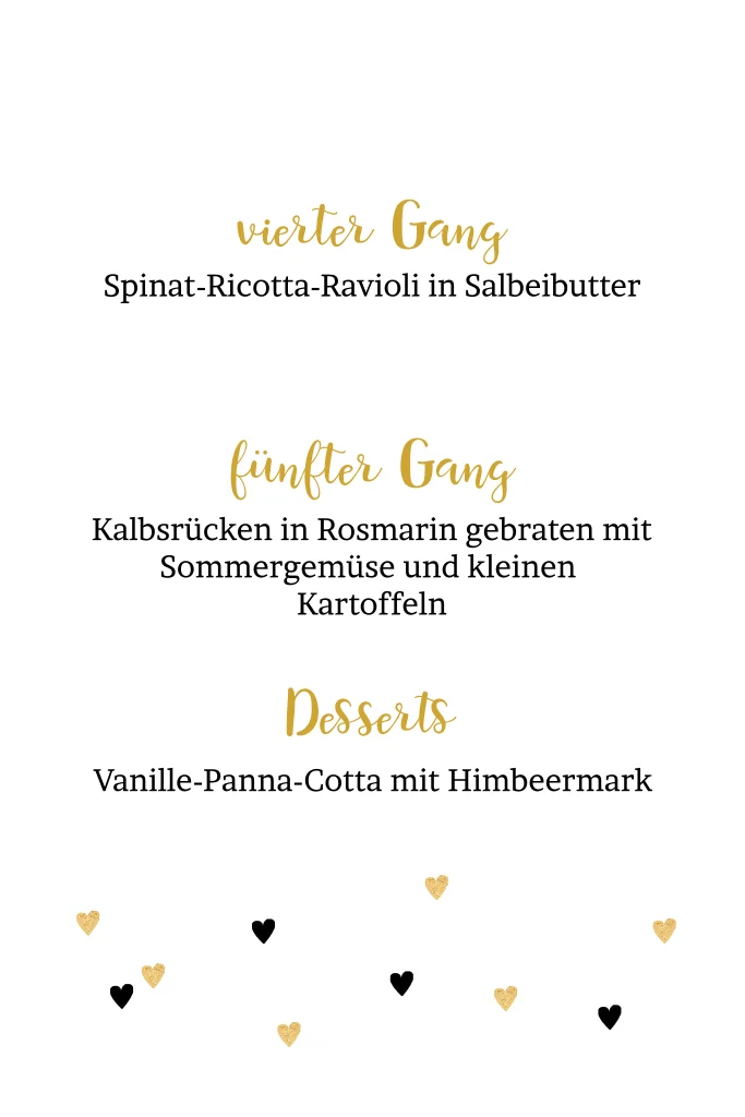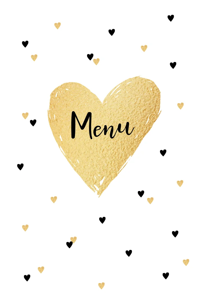 Dieses Menü ist mit Herzen in Gold und Schwarz dekoriert: hipp und romantisch! Das große, goldfarbene Herz mit dem Text 'Menü' ist wunderschön. Passt das zu Ihrem Stil?