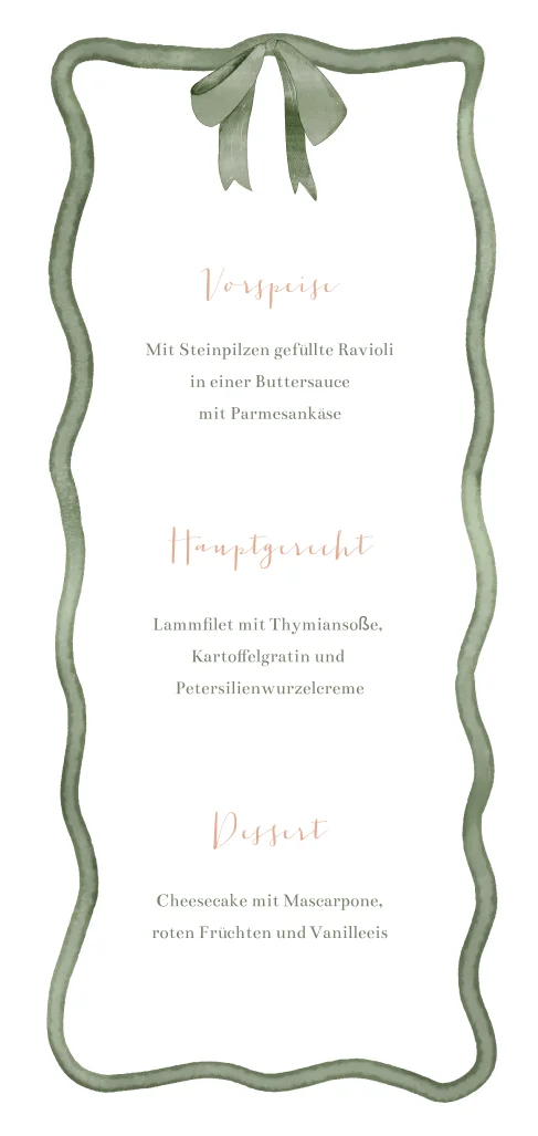Menükarte für Hochzeit in Weiß mit grünem, welligen Rand und Schleife