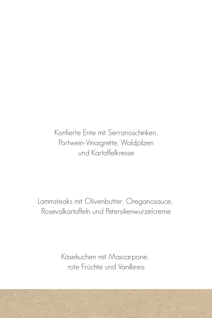 Einfache, aber sehr schicke Menükarte für euer Festmahl. So wissen die Gäste im Voraus, was es zu schlemmen und zu trinken gibt, denn auf der Rückseite befinden sich die Weine! Kraftpapier mit Roségoldfolie, eine tolle Kombination!Dazu empfehlen wir stylische Kartenhalter aus echtem Holz, um die Karte in voller Pracht zu präsentieren. Hier gelangst du direkt zur Auswahl.