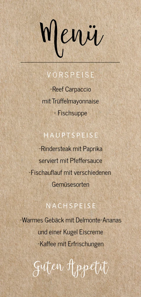 Die Menükarte auf dem feierlich gedeckten Tisch lässt Eure Gäste von Herzen zugreifen. Neben den Tischkarten sind die Menükarten der wichtigste Teil der Hochzeitspapeterie für die Feierlichkeiten nach der Trauung. Karten auf Vintage Kraftpapier bestechen durch einen hippen Designkarton im rustic Kraftpapier-Look und sind mit modernen Schriftzügen bestückt absolut im Trend.Hast du schon die dazu passende Save the date Karte, Hochzeitskarte und Dankeskarte gesehen?