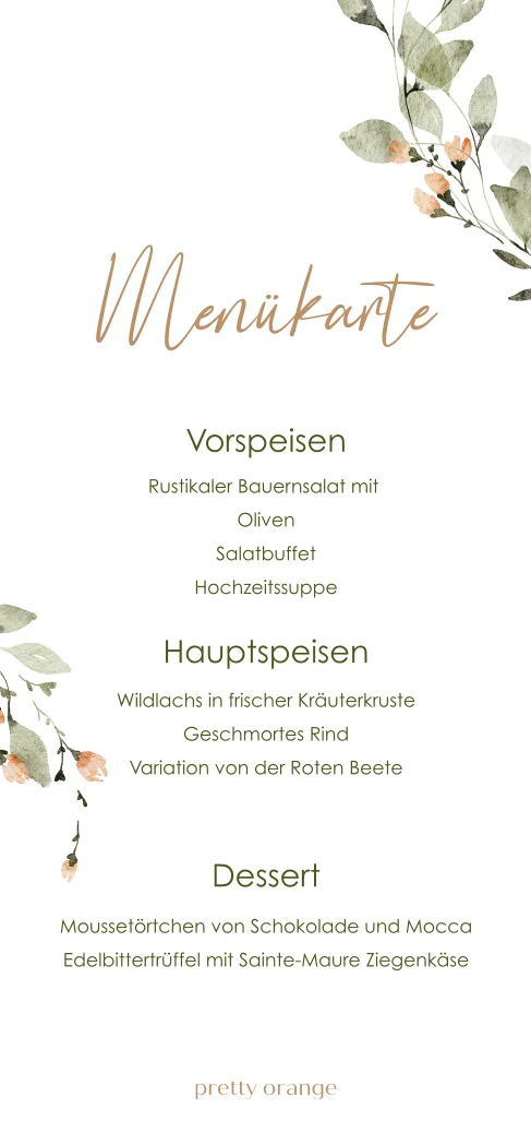 Elegante Menükarte mit feinen Aquarell Blumen.